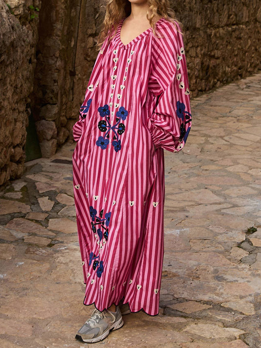 Printed Stripes V Neck Loose Maxi Dress