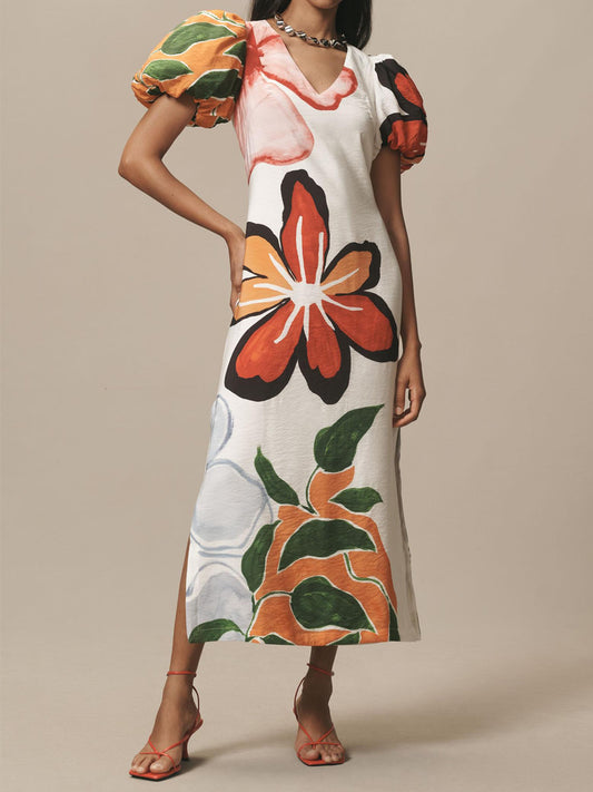 Printed V Neck Puff Sleeve A-Line Maxi Dress