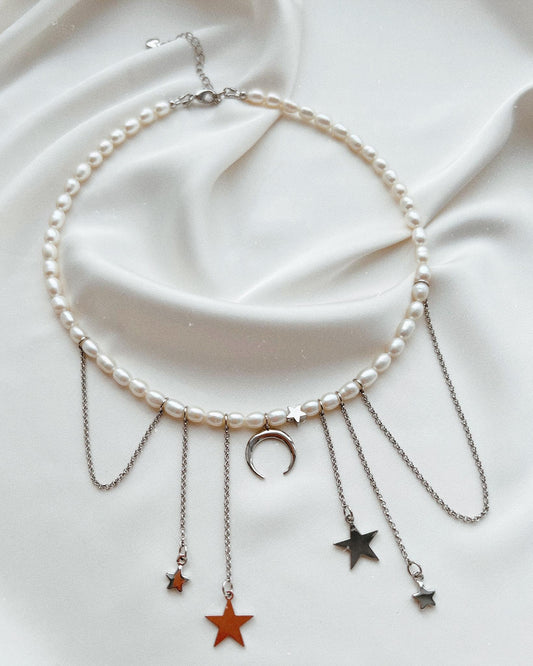 Rhinestone Star and Moon Tassel Pearl Necklace