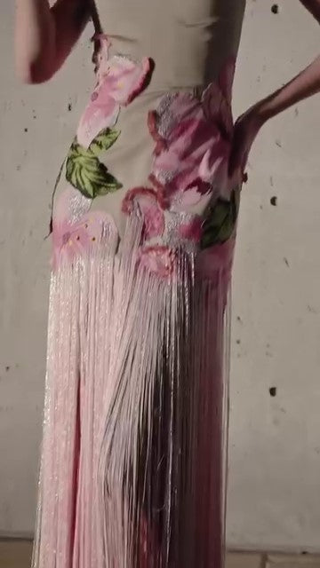 Sleeveless Embroidered Faille Gown With Fringe
