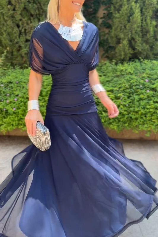 Navy Blue Chiffon V Neck Dress
