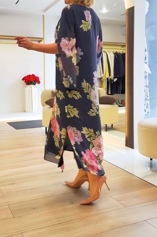 Applique Floral Tie Neck Blouson Sleeve Maxi Dress