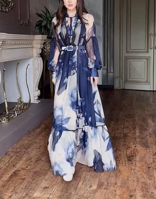 Blue Printed Chiffon Waistless Maxi Dress