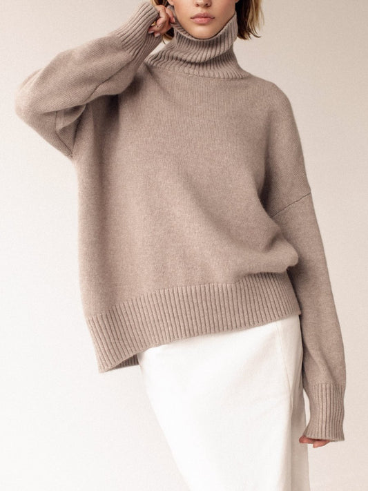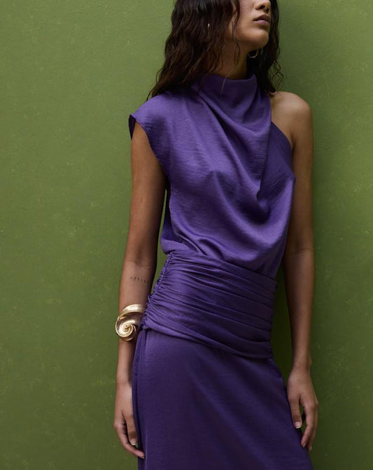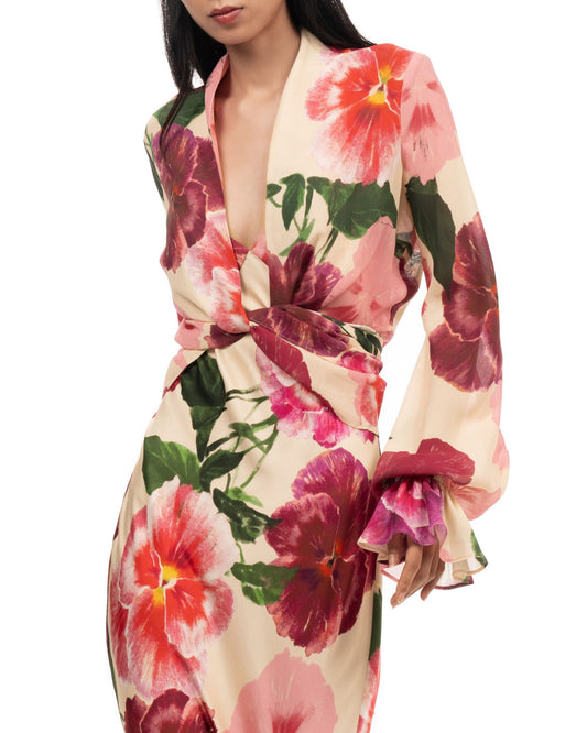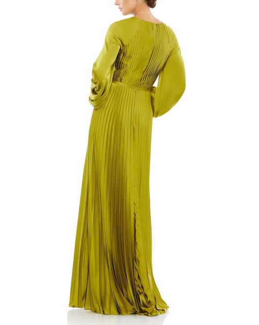 Pleated High Neck Raglan Long Sleeve Side Slit Gown