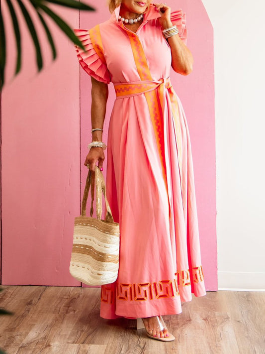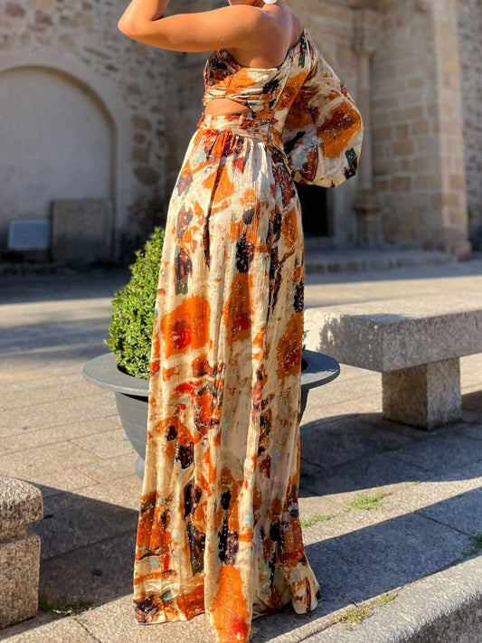 Printed Lace Up Pleated Maxi Dress