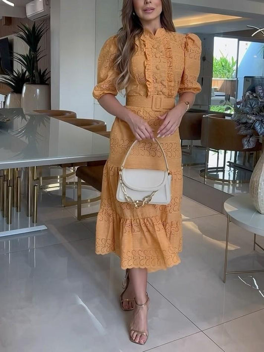Solid Lace Midi Dress With Belt