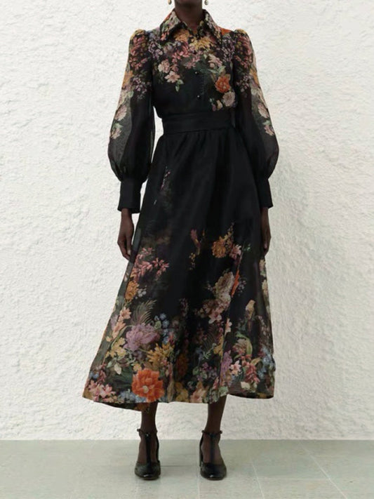 Printed Long Sleeve Mock Neck A-Line Maxi Dress