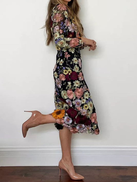 Floral Embroidered Boat Neckline See Through Long Sleeve Party Midi Dress