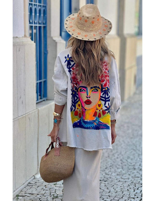 Ecru Jacket with Woman's Drawing and Floral Headband on the Back