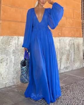 Blue Gemstone Chiffon Ruched Gathered Waist Maxi Dress