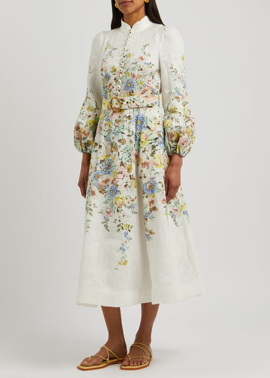 Floral-Print Linen Midi Dress