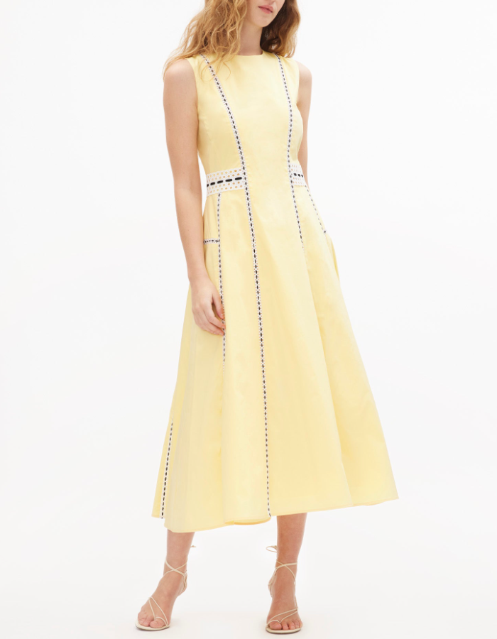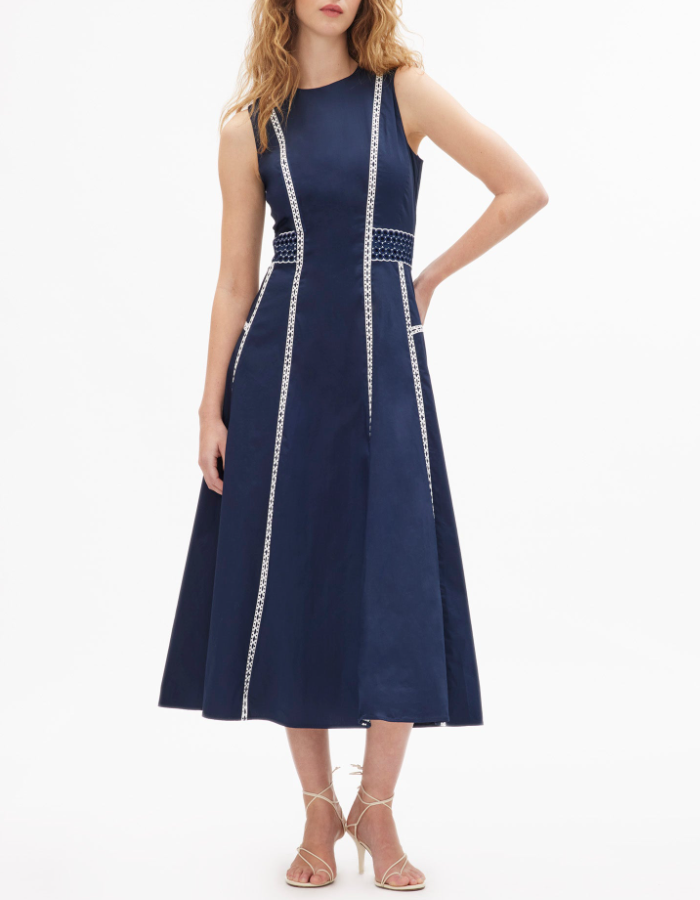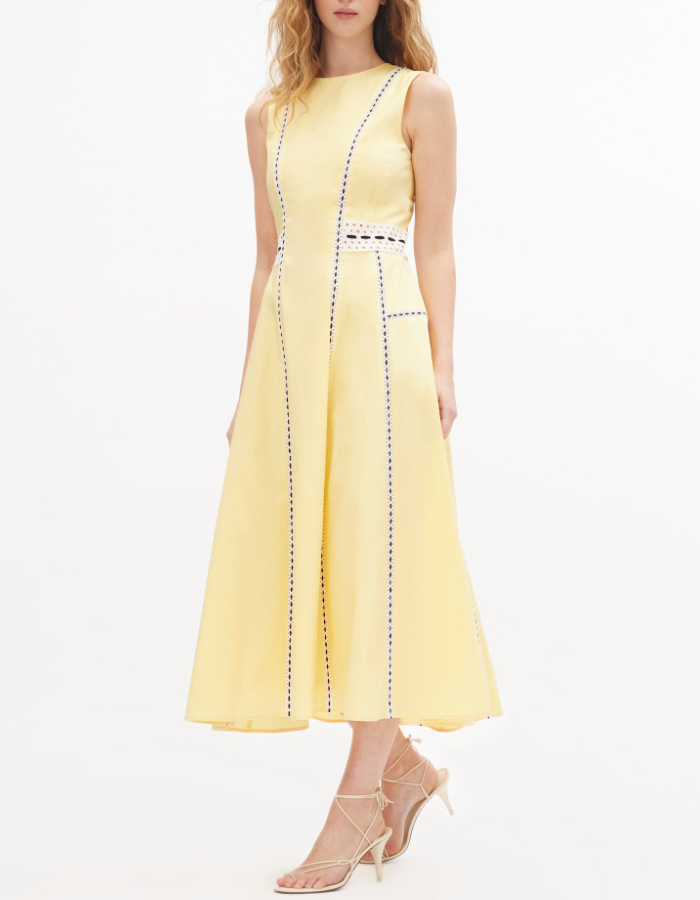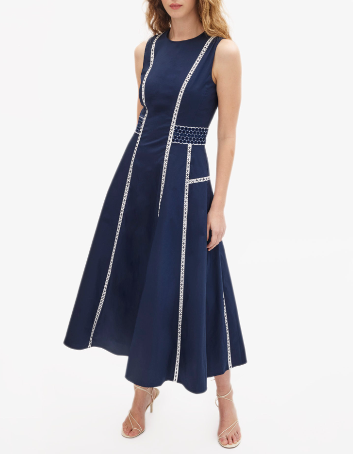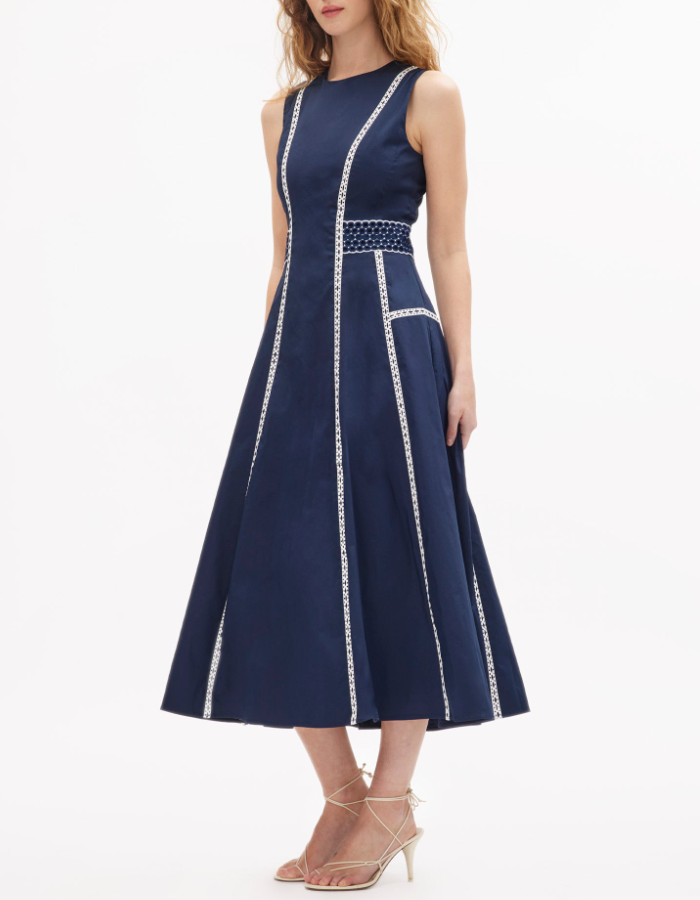 A standout silhouette of the spring season, the Dress embodies fresh tailoring with effortless charm. Featuring a sleek A-line paneled silhouette and eyelet lace trim, it is thoughtfully designed with perfect proportions and refined details throughout. Style it with an everyday flat for a relaxed feel or a simple heel for a more formal look, perfect for a Spring day-to-evening party.