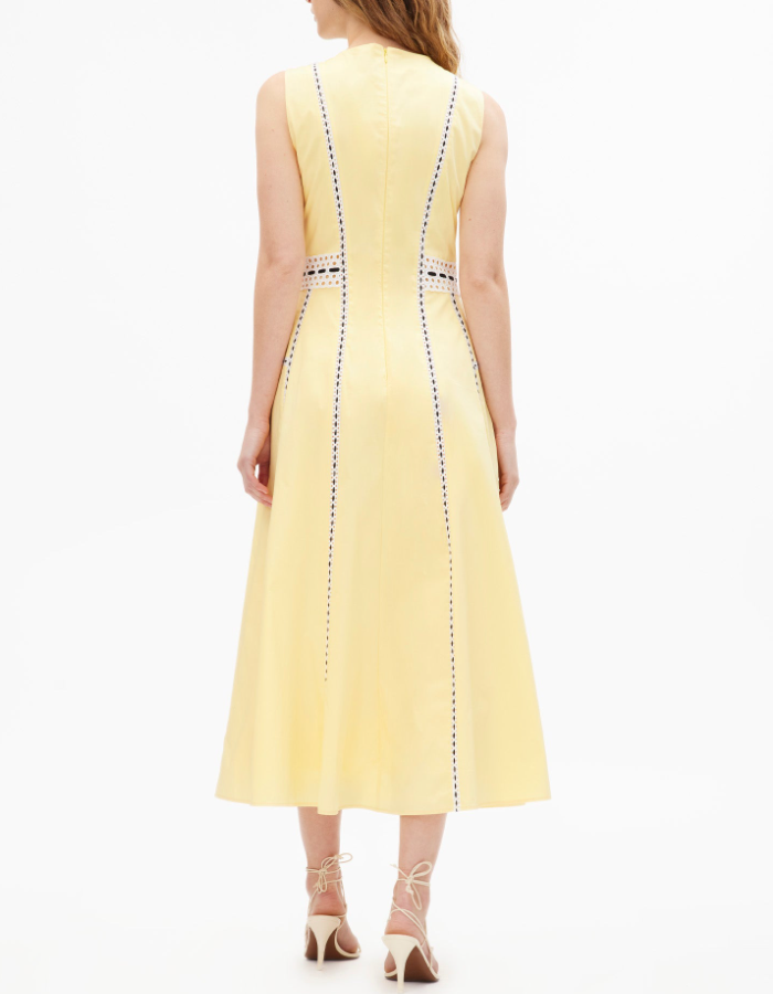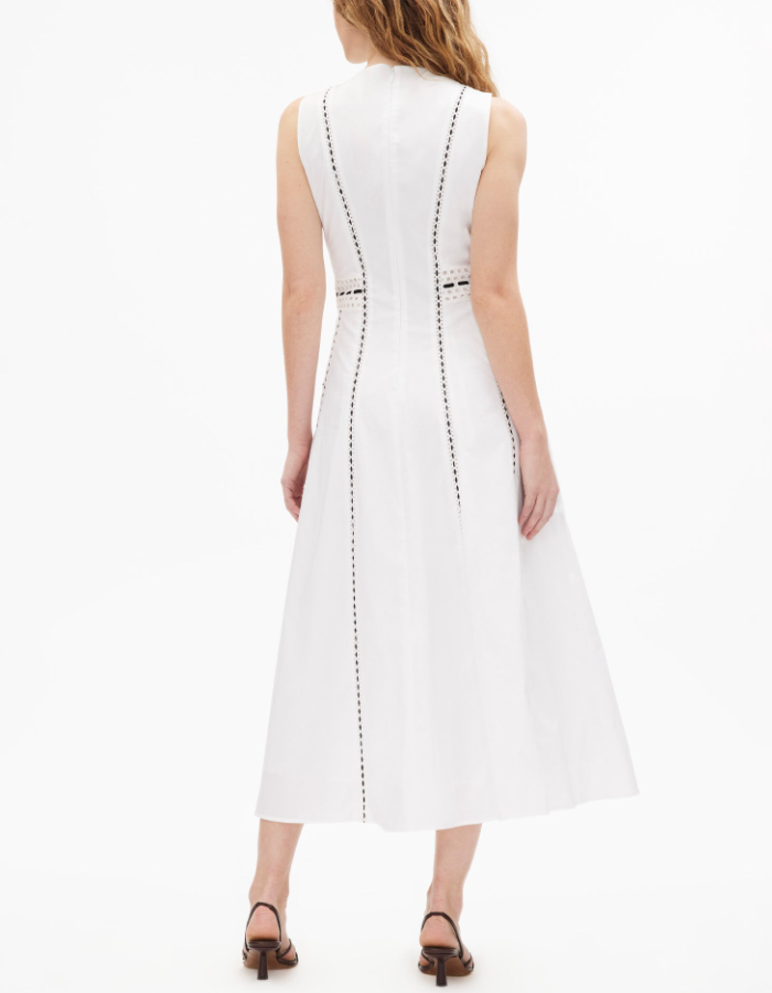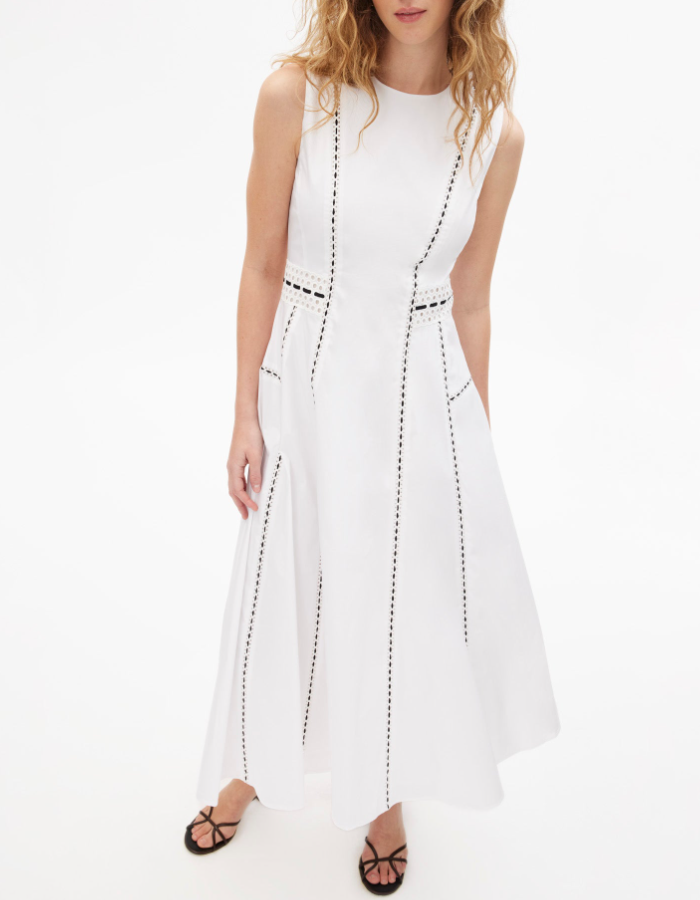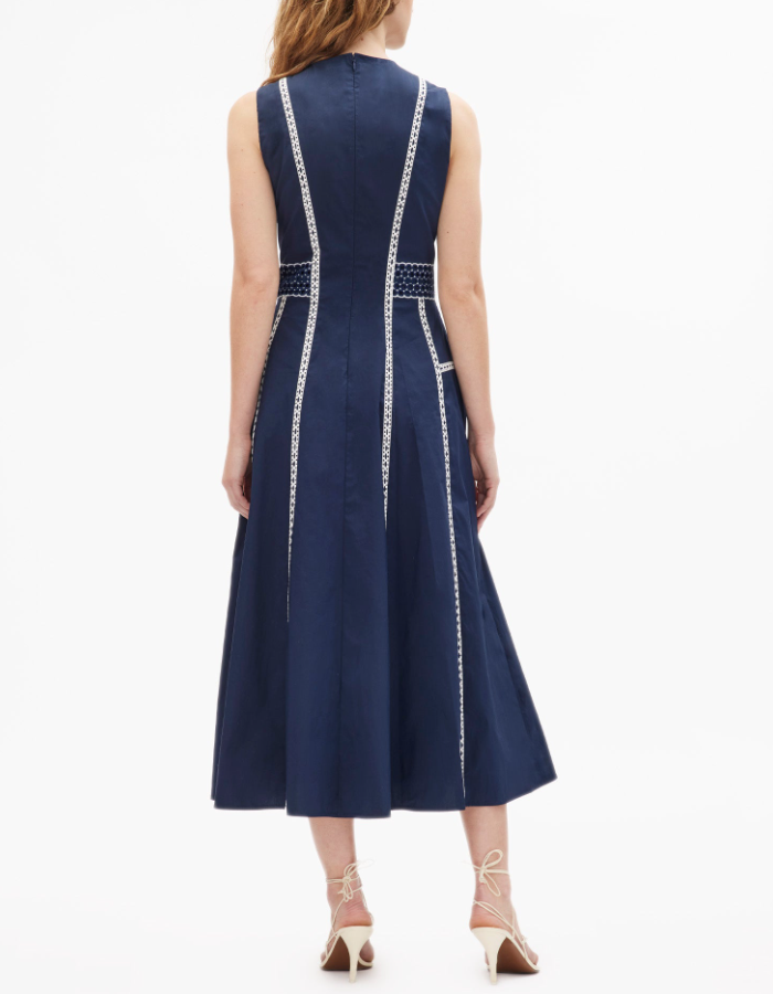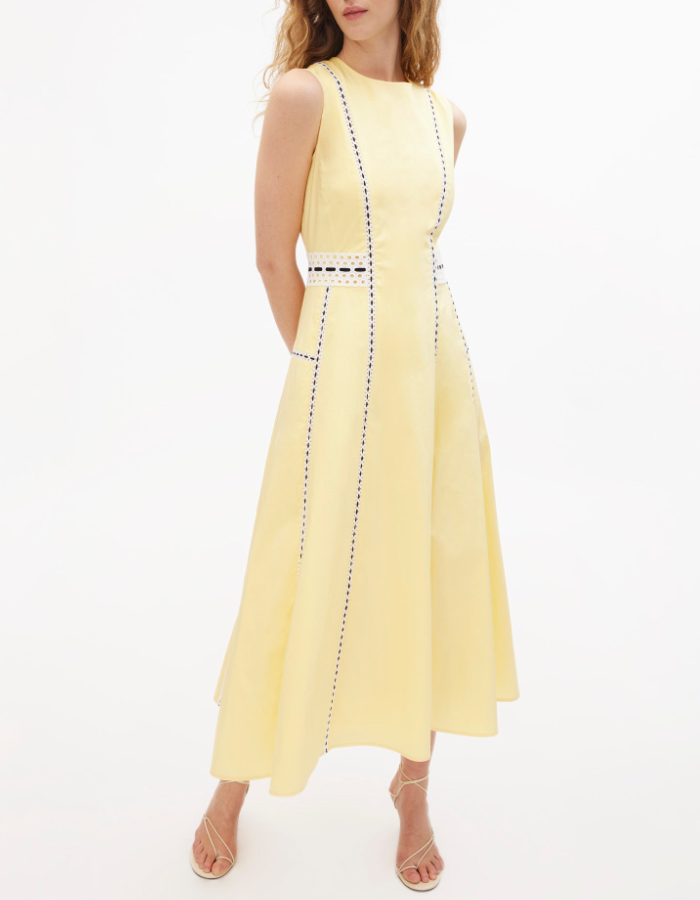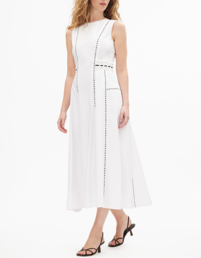 A standout silhouette of the spring season, the Dress embodies fresh tailoring with effortless charm. Featuring a sleek A-line paneled silhouette and eyelet lace trim, it is thoughtfully designed with perfect proportions and refined details throughout. Style it with an everyday flat for a relaxed feel or a simple heel for a more formal look, perfect for a Spring day-to-evening party.