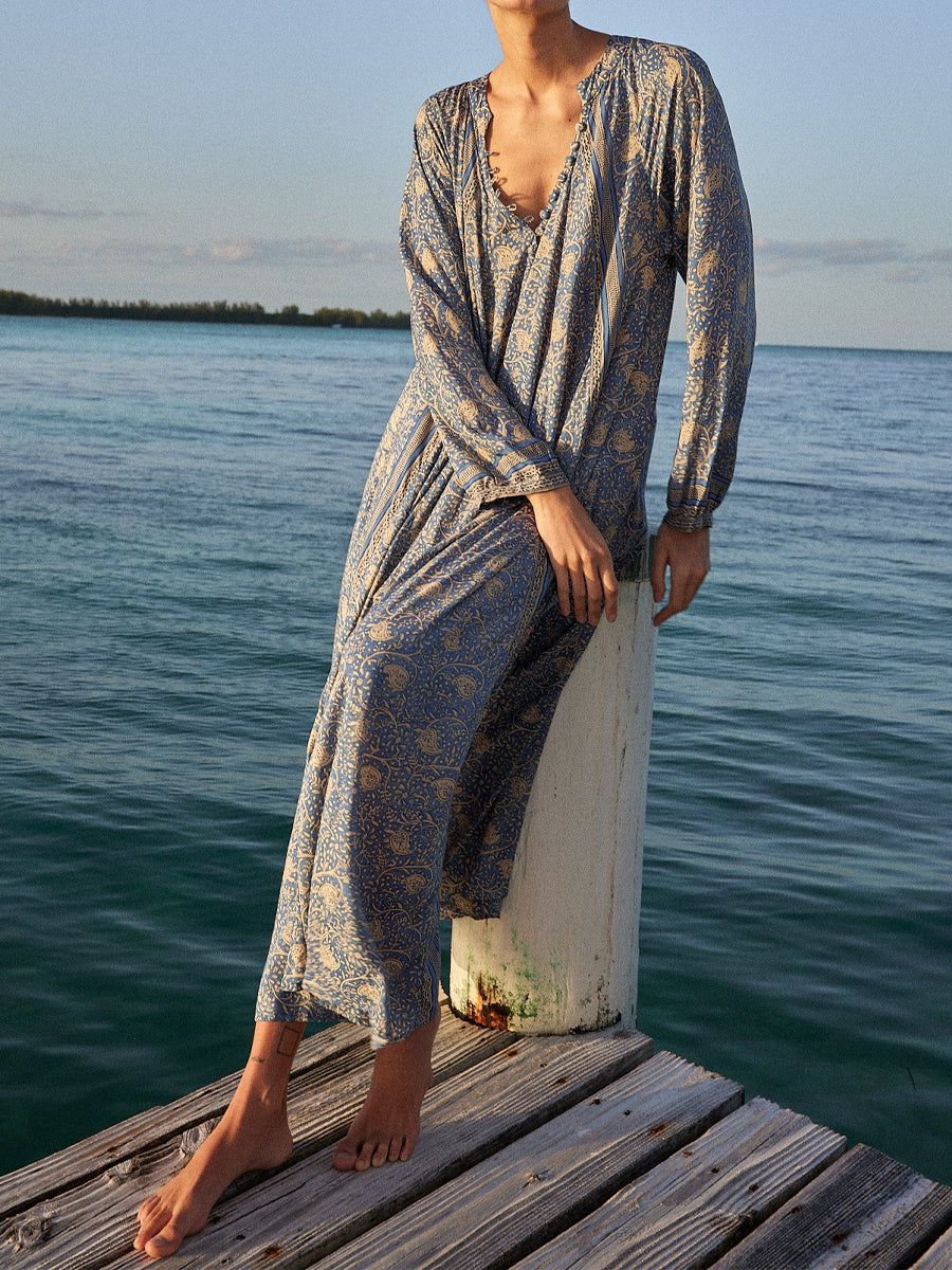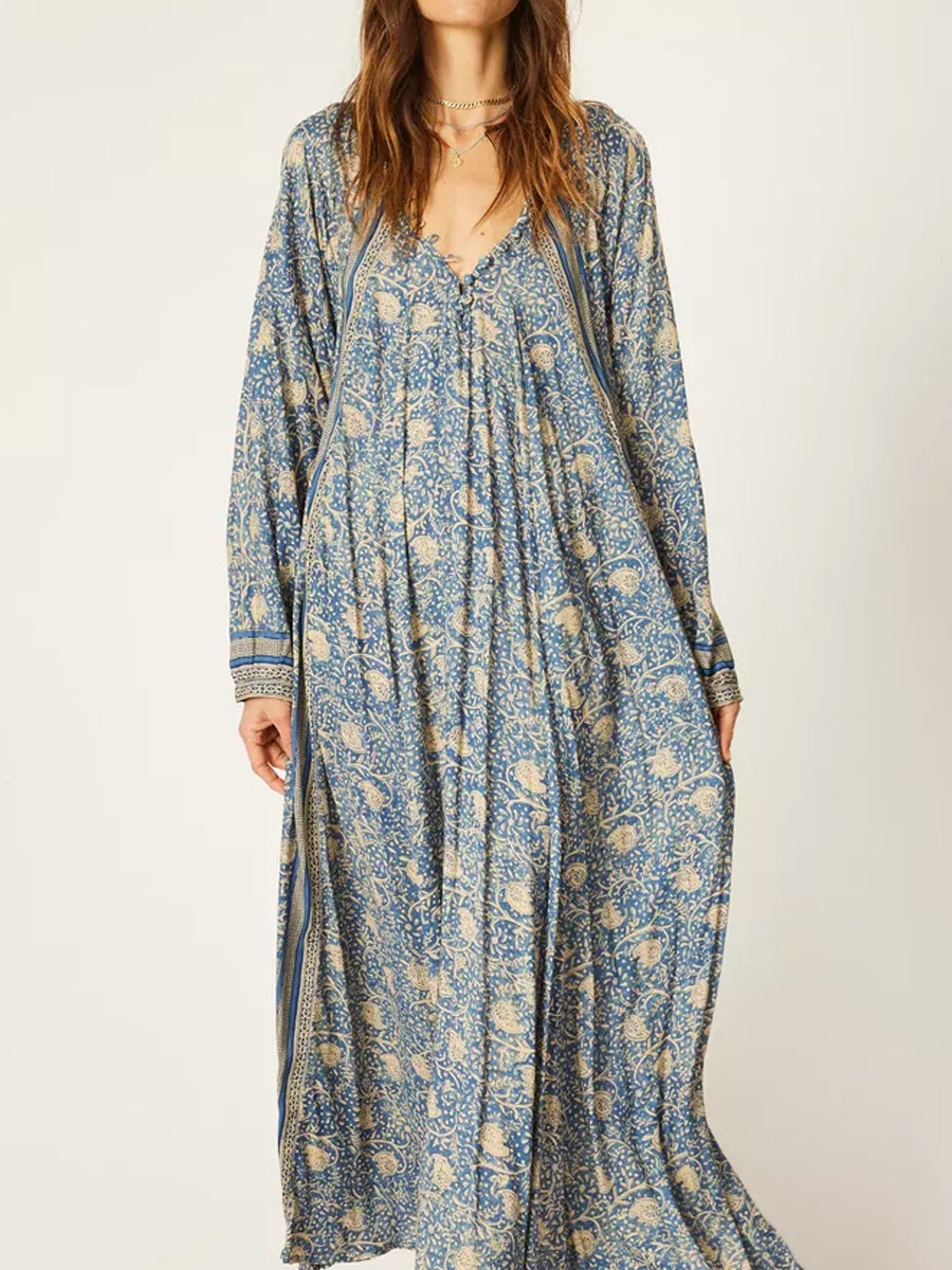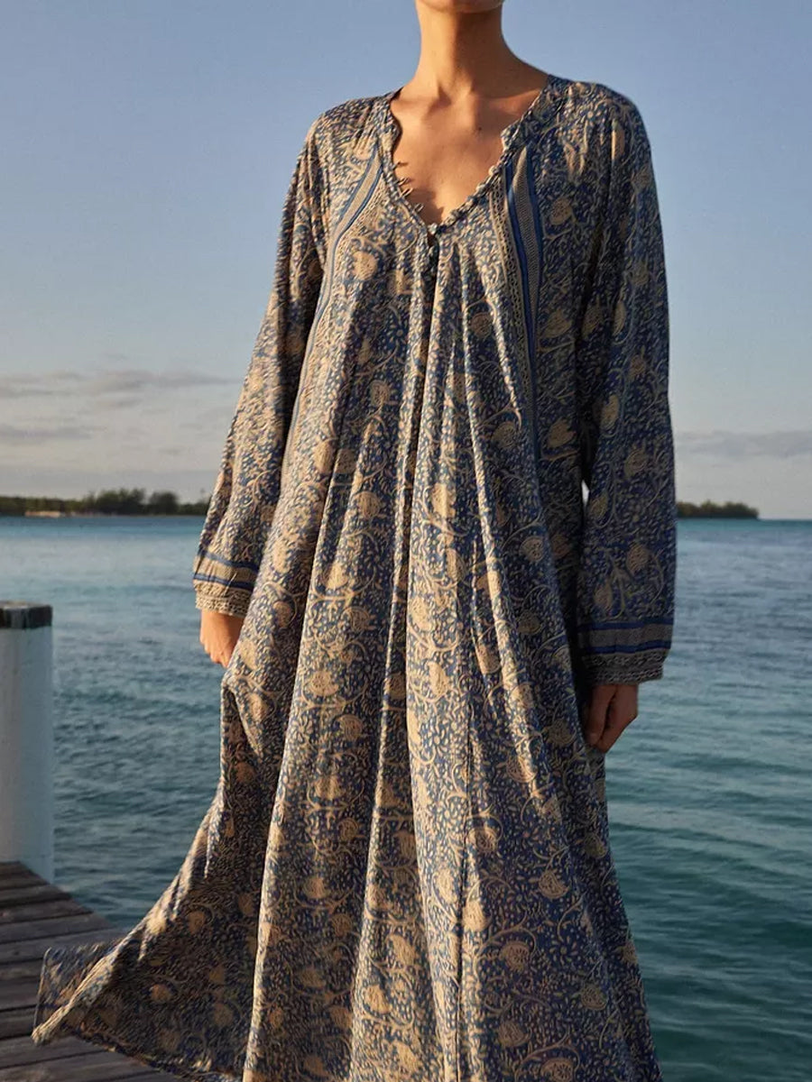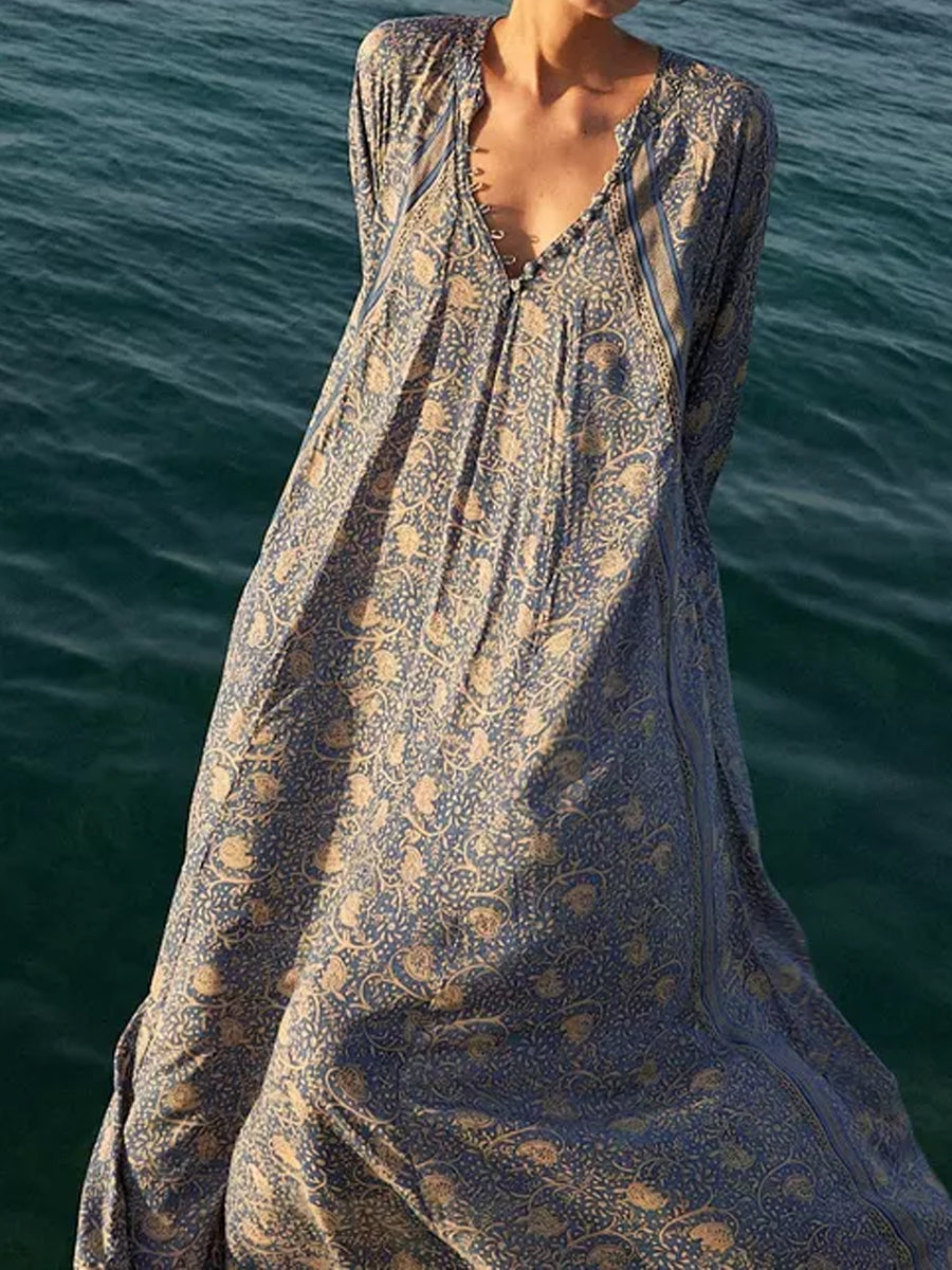 Deep V-neck With Covered Buttons Printed Dress