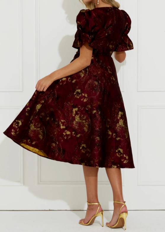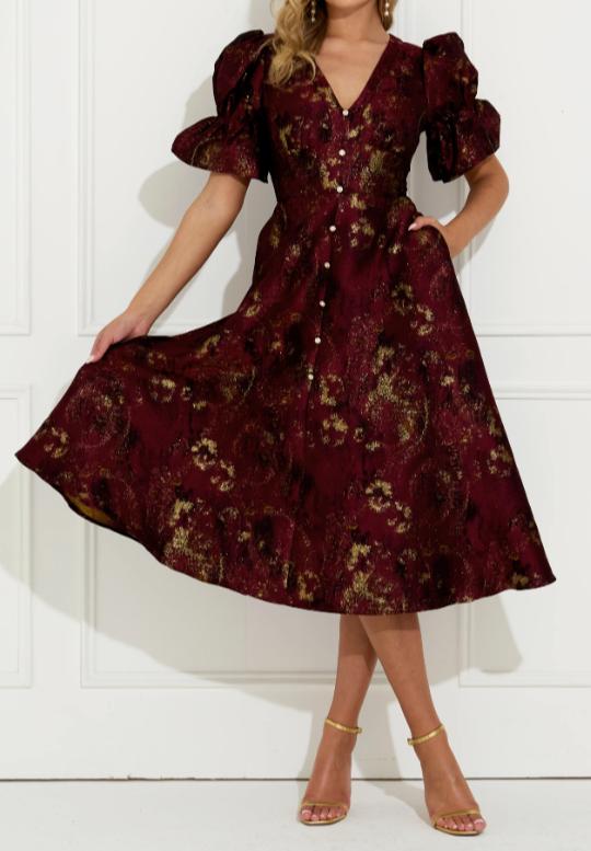 Golden Jacquard Holiday Dress With Pockets