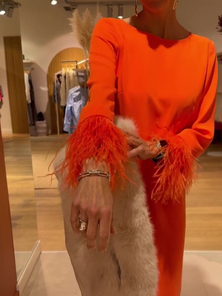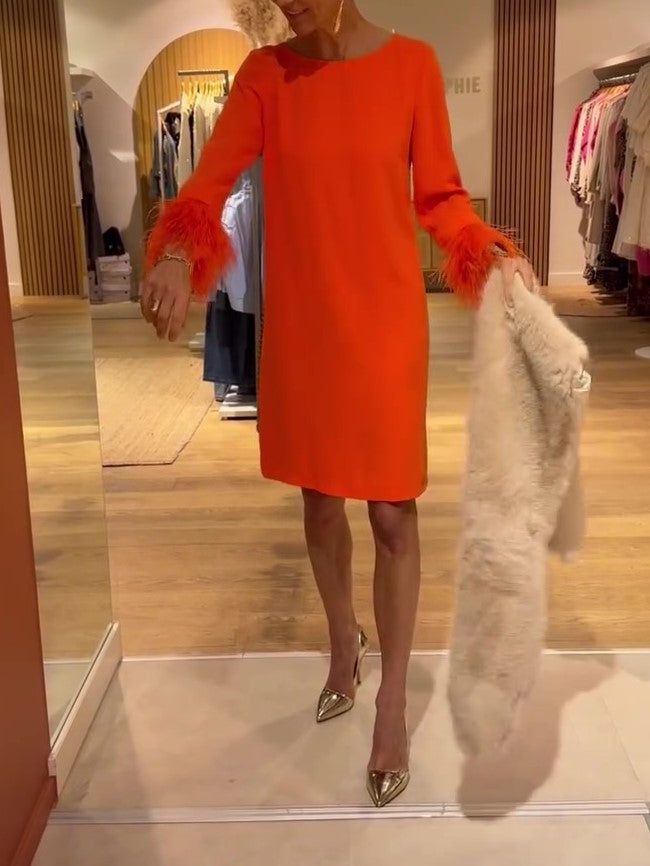Mena Feather Cuffs Crewneck Pocket Casual Mini Dress