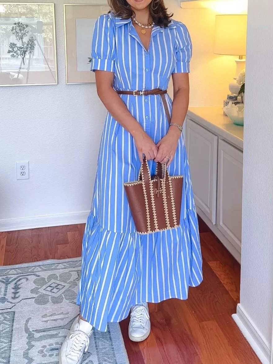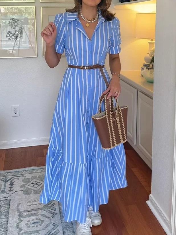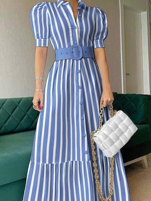 Casual Puff Short Sleeve Ruffle Hem Maxi Dresses With Belt