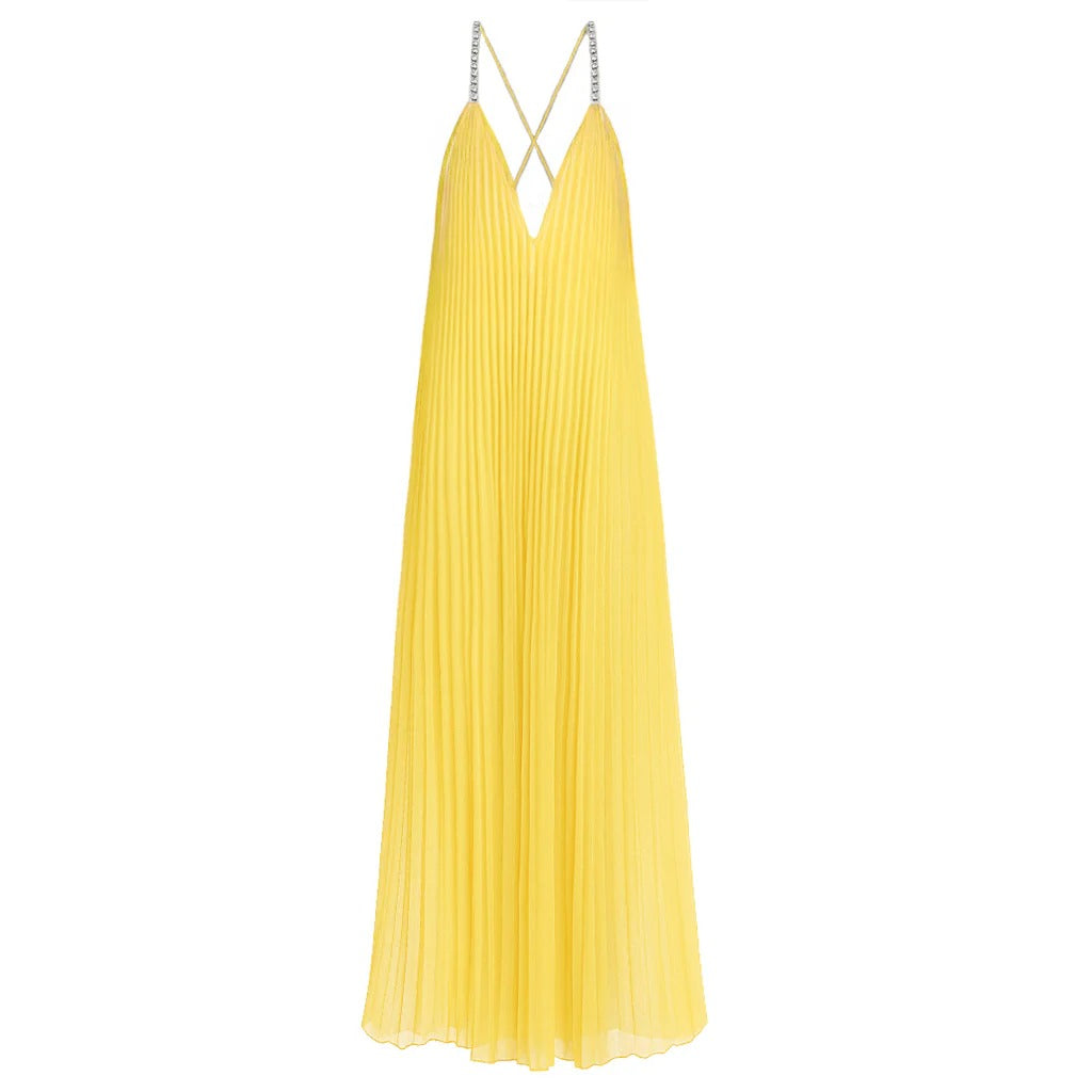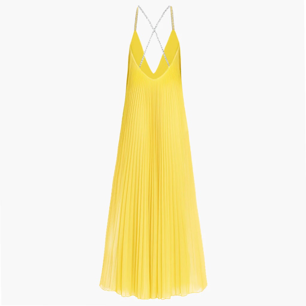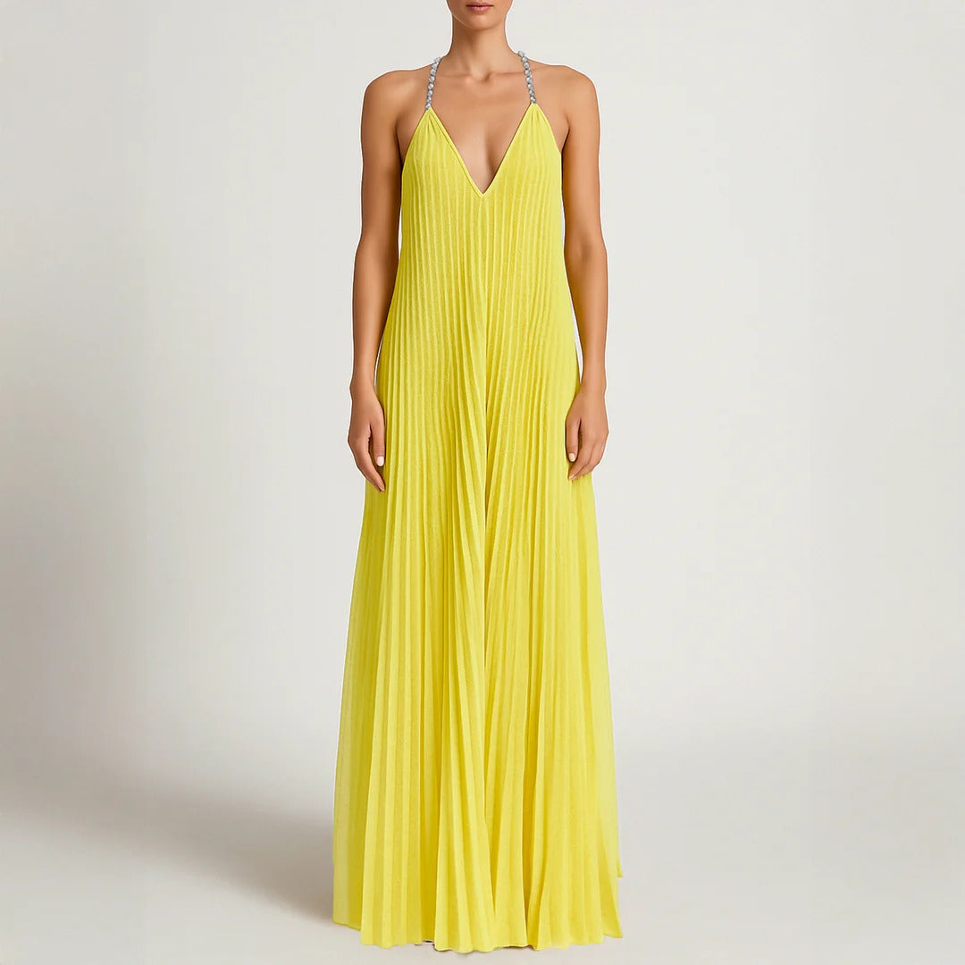 Crafted from lightweight pleated charmeuse, this gown radiates fluid movement with every step. The plunging neckline is anchored by crystal-embellished chain straps, adding a glint of precision to its effortless drape.