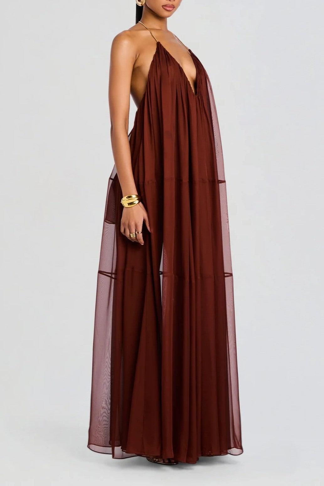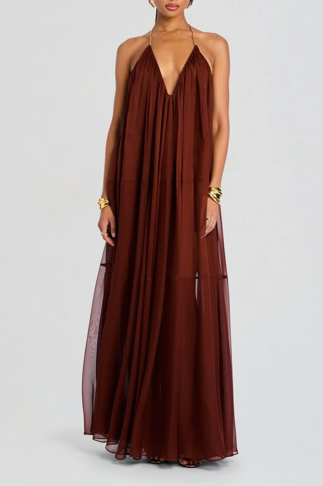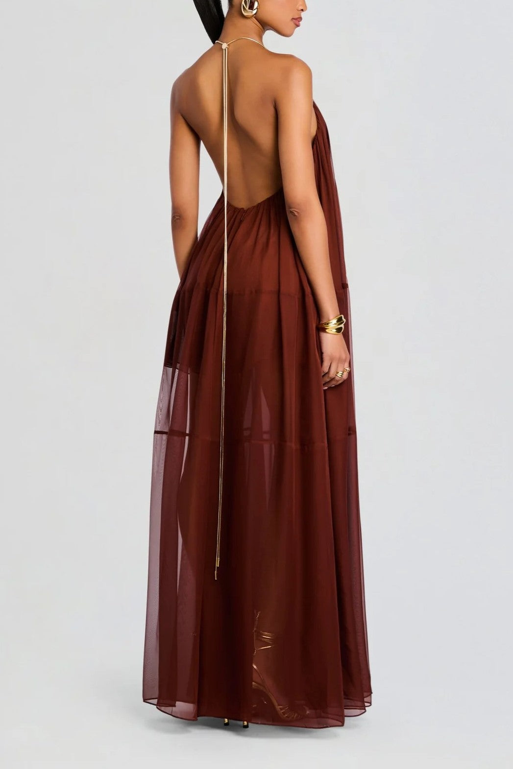 The Chiffon Dress features a plunging neckline with a unique chain halter neck detail and an open back design for a modern, elegant look. Made from lightweight chiffon, this dress flows beautifully, offering a comfortable fit paired with refined style. Shown here in Chestnut.