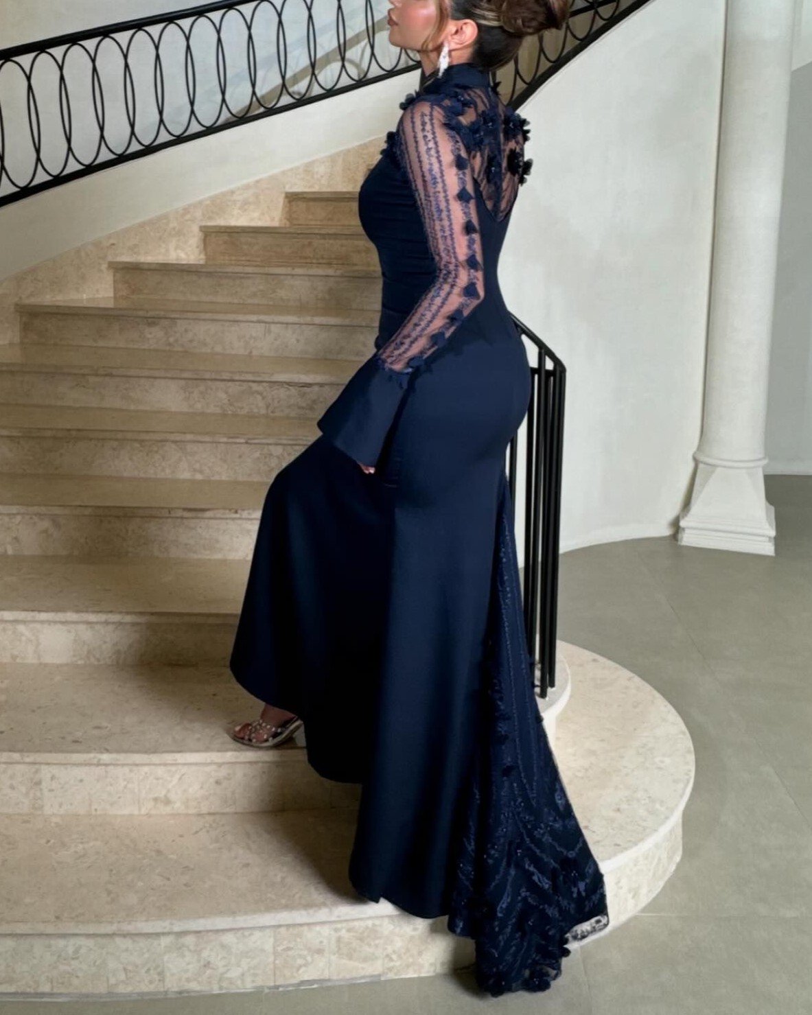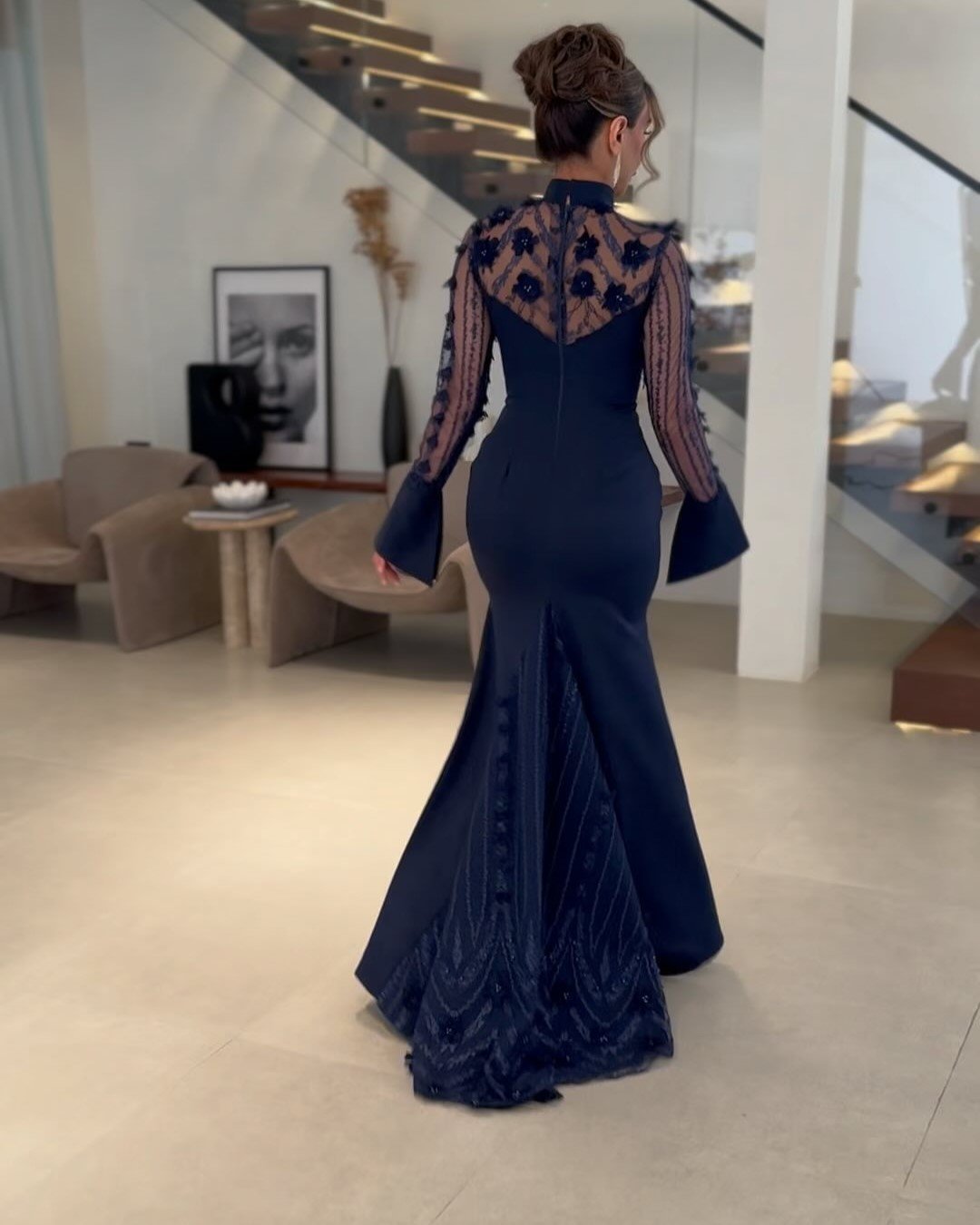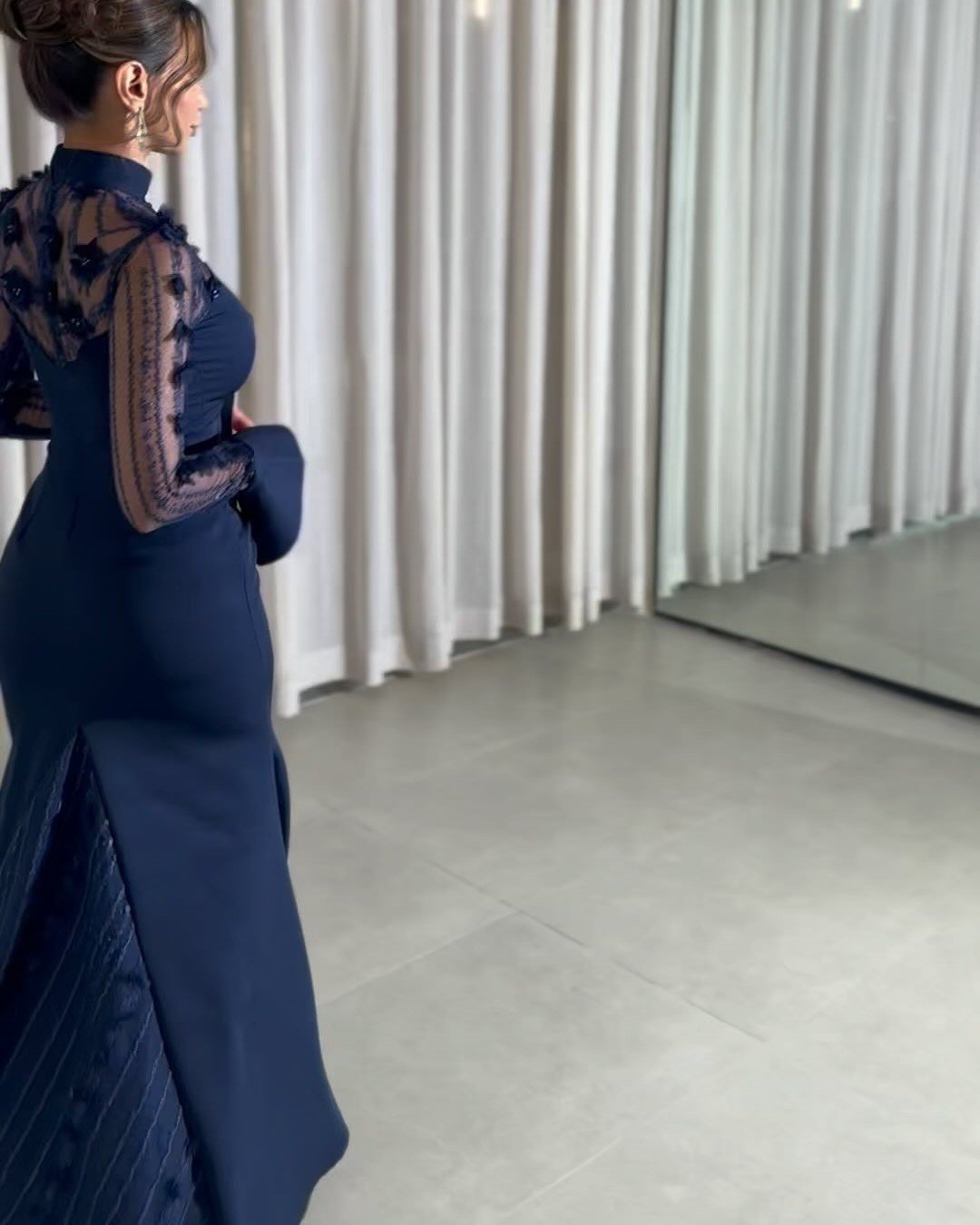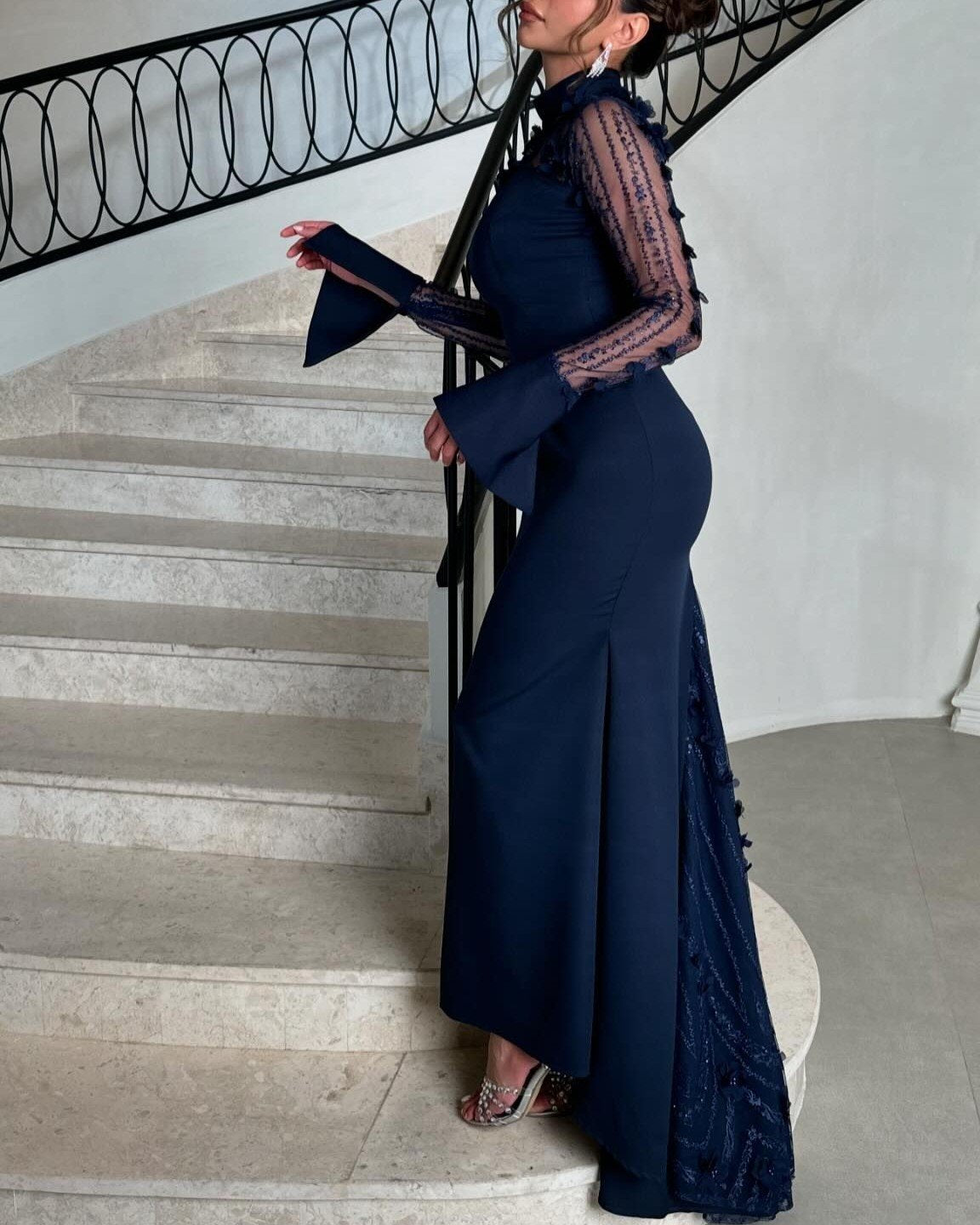 Navy Blue Net Patchwork Elegant Slim Dress