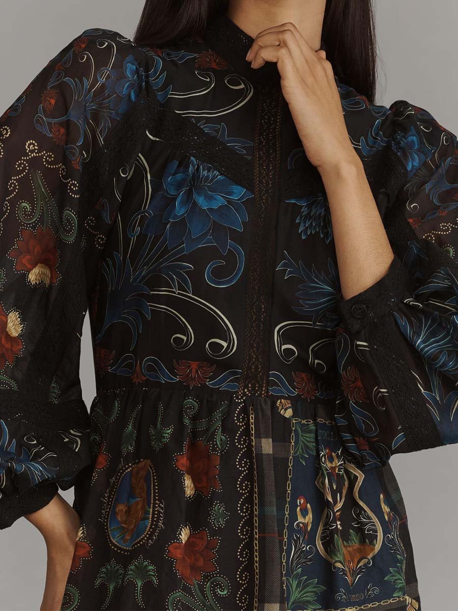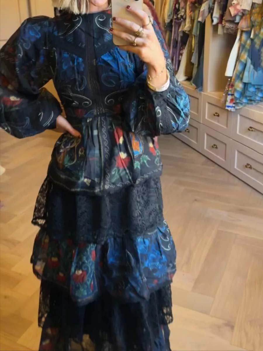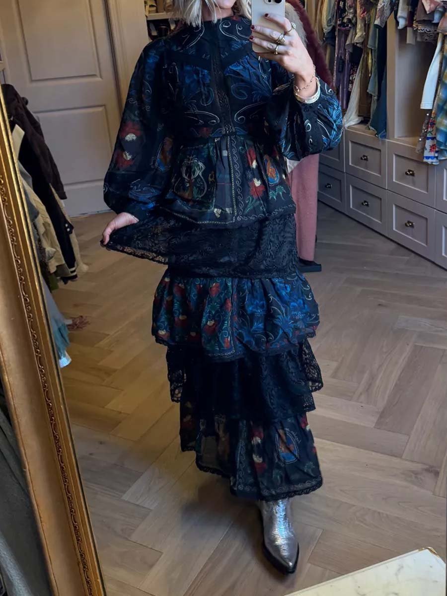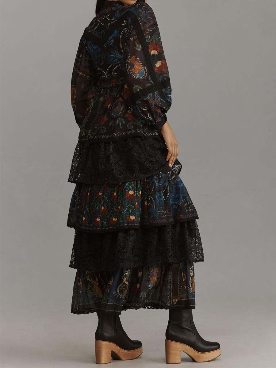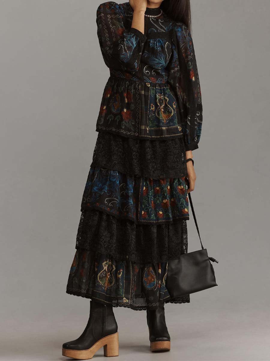 Printed Long Sleeve Mock Neck A-Line Maxi Dress