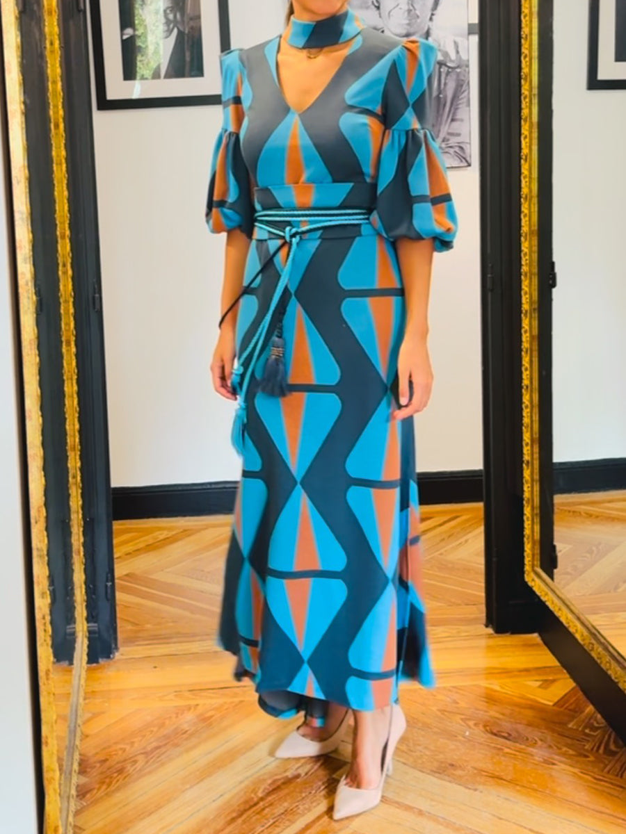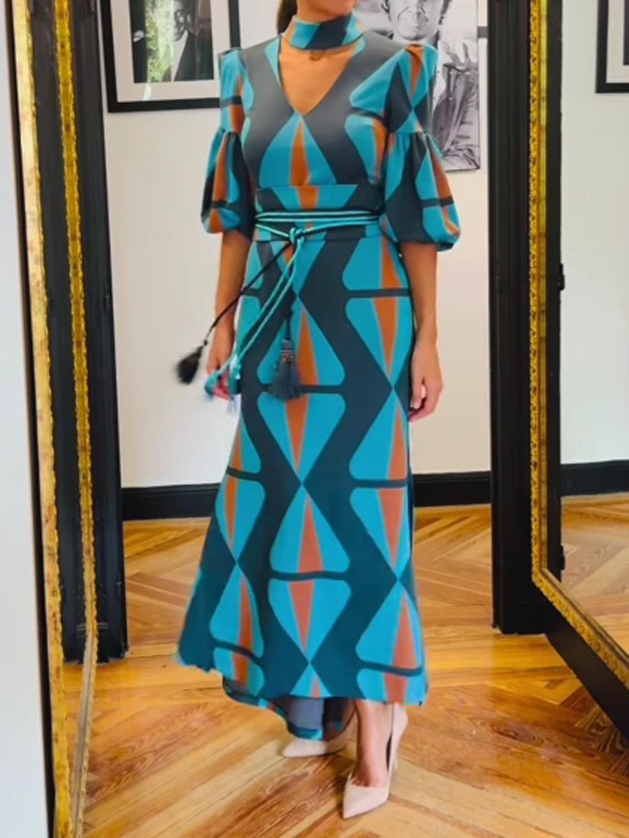Printed V Neck Puff Sleeve Dress